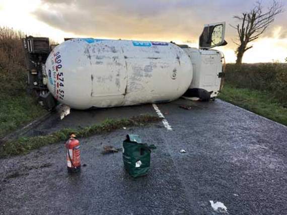 The tanker contained 14,000 litres of LPG, which had to be decanted before it righted, says Cornwall Fire and Rescue Service.