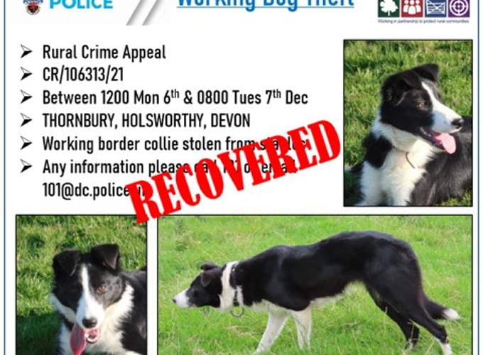POLICE recently circulated an appeal in relation to the theft of a working dog from the Holsworthy area and are pleased to announce the dog has been located and recovered.
