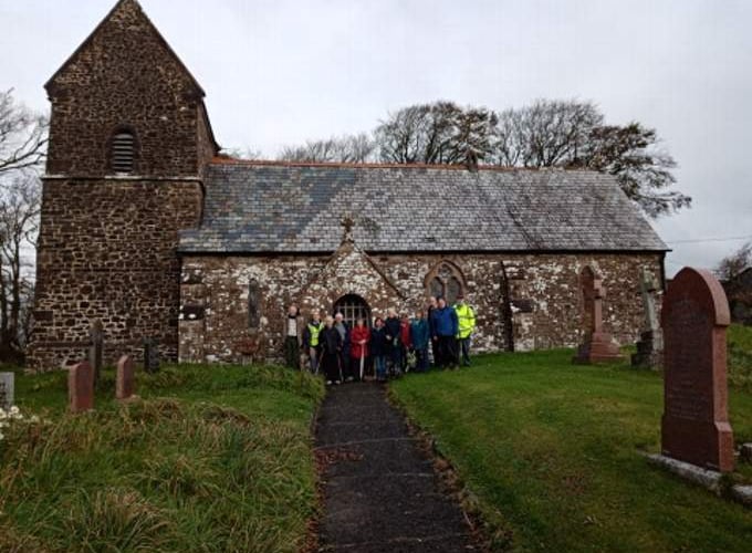 Thanks were expressed to Margaret, the organist of St Petroc Church in Hollacombe for showing the walkers round. In the porch is a lintel dating from the 12th century and the church had various architectural additions in the 13th century followed by significant restoration in the 1880s. The tower is unusual having a saddle back roof, housing three bells which unfortunately have not been peeled since the 1930s due to safety reasons.