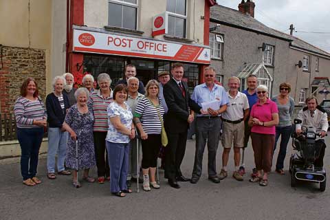 DES Lake is pictured being presented with gifts on his retirement, along with Bude Postmaster Luke Francis, Week St Mary Post Office’s Jeff Roberts and village residents. Picture: Paul Hamlyn