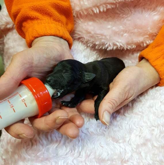 The seven remaining puppies were now orphans and needed one-to-one 24-hour care. Ruth took the puppies home and started the difficult and tiring process of hand rearing them. They need to be kept warm and clean and fed a specialist veterinary milk every two or three hours, after which they need help to go to the toilet. Due to a lack of colostrum from their mother’s milk, which contains antibodies to protect new born animals against disease, it was highly unlikely the puppies would survive. Sadly two puppies were not strong enough and within the first four or five hours they passed away.