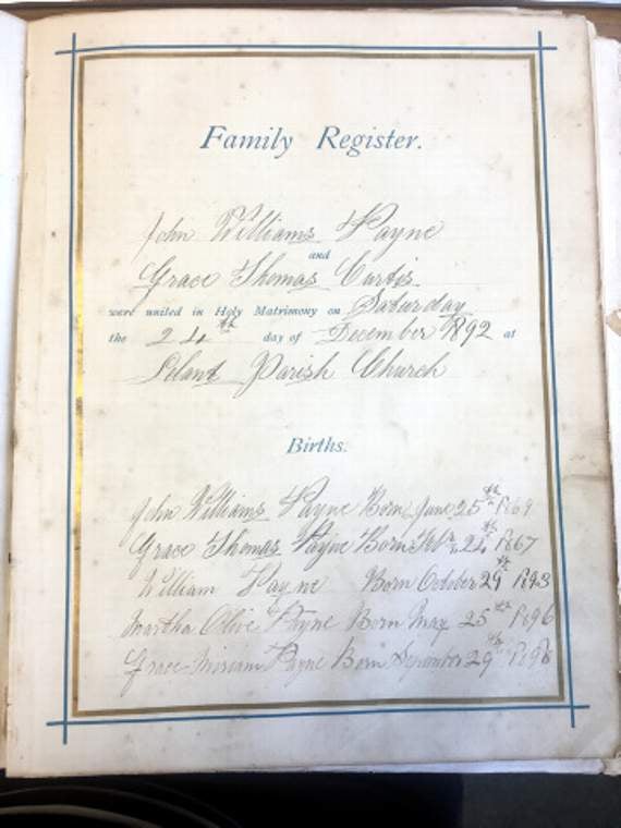 On a page entitled ‘Family Register’ it reads: ‘John Williams Payne and Grace Thomas Payne were united Holy Matrimony on Saturday the 24th day of December 1892 at Lelant Parish Church.”