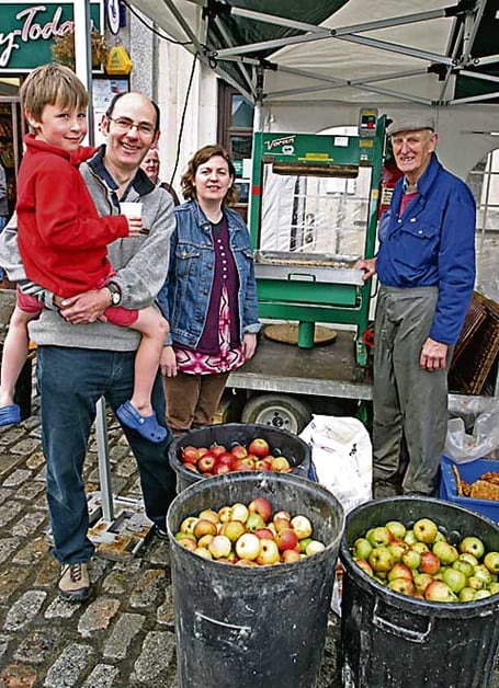 APPLE PRESSING: Pictured above are Michael Browne, with son Miles Browne, from Launceston, Clare Tamplin from Rezare, and Tony Atkinson, Tamar Valley Orchard Volunteers, all taking part in the successful Apple Pressing Day.