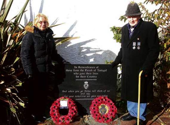 Poppy wreathes were laid at the foot of the memorial stone by Elizabeth Headon, representing Tintagel Primary School, and Vaughan Williams on behalf of the Royal British Legion.