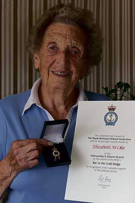 THE dedicated service to the RNLI of 92-year-old Mrs Betty Oke of Holsworthy was recognised on Thursday June 30 at a ceremony at Dartington Hall when she was presented with the Bar to the Gold Badge by the chairman of the RNLI, Charles Hunter-Pease, writes Christine Williams.
