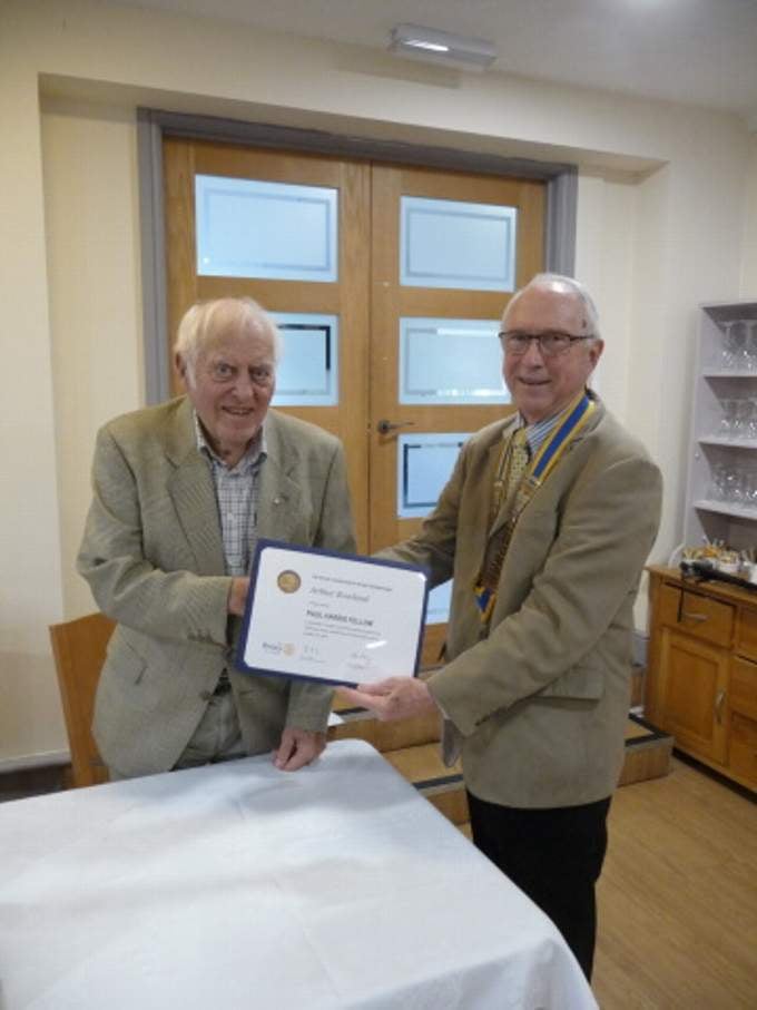 A strong supporter of Rotary activities and in recognition of his long-standing membership of Rotary, he has been awarded a Paul Harris Fellowship for his service to the club and the local community. Arthur is a retired local auctioneer and has seen many changes in Rotary and the locality over the years. For example, Rotary has changed from an all-male membership to include lady members and the sad fact that many of the founder members had businesses in the town and local area which have now closed and not been replaced.