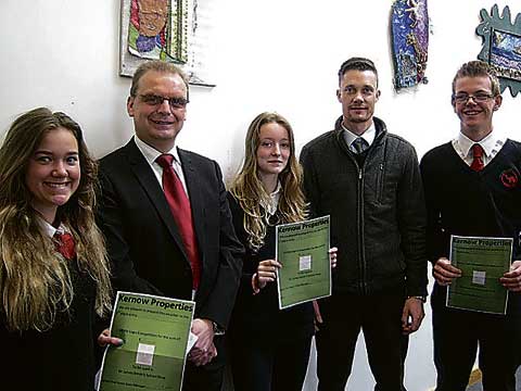 STUDENTS Neisha Boundy, Becky Stocker and Jacob Todd receive their prizes, for their winning logos, from Paul Boase of Kernow Properties, who helped arrange the competition with Subject Leader for art at Sir James Smith’s Community School, Ben Langton, who was also present at the ceremony.