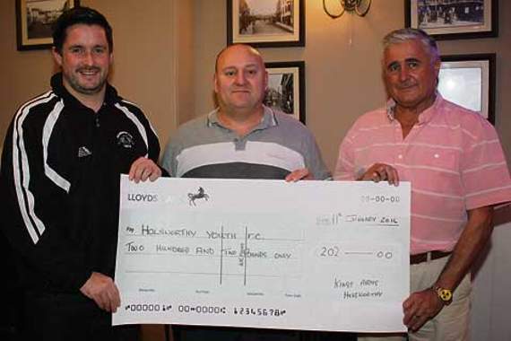 The King’s Arms in Holsworthy presented a cheque for £202 to Holsworthy Youth Football. The money was raised by landlords Ashley and Jill Tallon. Each week bonus ball money — £9 of £49 — is saved and given to charity at the end of the year. The winner of the last bonus ball can choose which local charity. Mike Maniglia won and chose Youth Football. Pictured are chairman Adam Chidley, Mike Maniglia, Ashley Tallon.