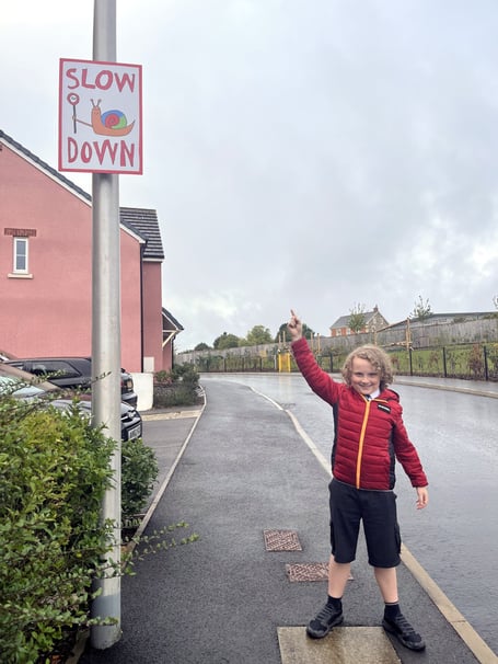 A young boy from Holsworthy is helping to encourage motorists to slow down with his winning sign design.