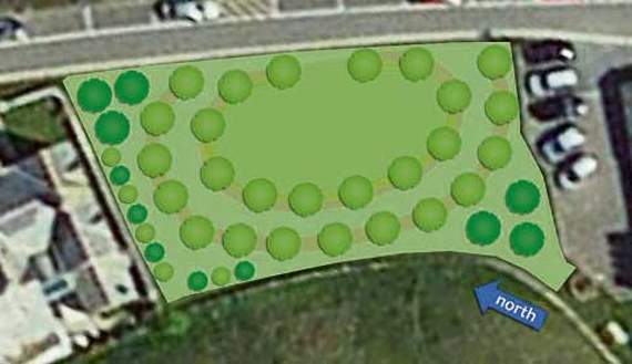 Within the centre of the orchard, the apple trees, which should give a height and spread of three to four metres, will be arranged in curved rows surrounding a central clearing, which will be used as a focal point for outdoor events.