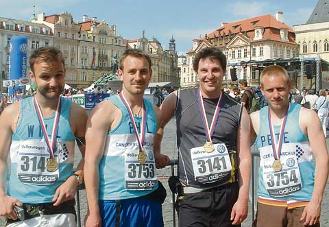 On May 10, four friends from Bude faced the hazards of cobbled streets, tramlines and blazing sunshine to run the Prague Marathon, raising money for Cancer Research. Will Mitchell, Will Heathcote and Phil and Pete Horton, all ex-pupils of Budehaven School, decided to undertake this challenge in a moment of madness one winter evening. The months of training around local coast paths and lanes paid off when they all successfully completed the run of over 26 miles in the beautiful Czech capital. An unusual sight for many competitors and spectators was the Cornish flag, proudly waved by the lads' supporters at several vantage points around the course to spur them on! This was Will Mitchell's second marathon, having run the New York last November in aid of the children's charity, Whizzkidz. For the others it was their first attempt at the distance. After completing the race the lads had a collective 'Steve Redgrave moment,' unanimously declaring that they never, ever wanted to repeat the experience, but it's amazing what a few days of rest and recuperation can do — they are already planning their next marathon!