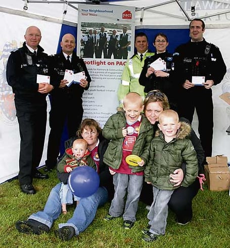 Pictured above, back row from left: PCSO Stuart Baxter, PC Dave Monkton, Station Enquiry Officer Alan Baxter, PCSO Lisa Jasper and PC Gary Luxton. Front, from left: Tom Gooding, Sheryl Humphrey and Freddie, Penny and Leo Gooding, who are all from Bude.
