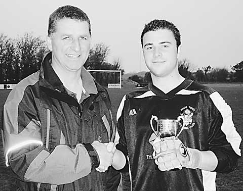 Bude first team goalkeeper Gary Dinshaw is the first name to go on the newly donated George 'Tubby' Gilbert Memorial Trophy. 'Tubby' Gilbert, who passed away in the summer of 2008, was an avid supporter of the football club and ex-player and rarely missed a match, his motto being 'If I can get there, I'll be there!' Andrew 'Wizzer' Wise kindly donated the trophy to the club in memory of 'Tubby' and thought it would be fitting if the supporters could have their vote for Player of the Year. It was a very close call with just 1-2 votes splitting four players but Gary got that extra vote and was presented with the trophy during the recent home game against Lifton.
