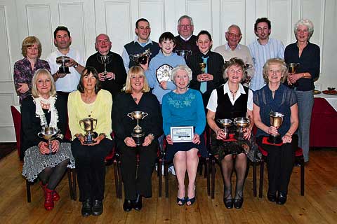 TROPHY WINNERS: Back row, from left, Rachel Drew. Tom Hunter, Roger Bosustow, Matthew Bosustow (Men’s Champion), Alex Hunter (Junior Champion), Richard Pearce, Andrew Troop, Peter Drew, Gary Bickle, Ann Mason (Ladies’ Champion); seated, Judy Crabtree, Sue Burges, Ann Venning, Marie Blackwell, Joan Coney and Ruth Pearce.