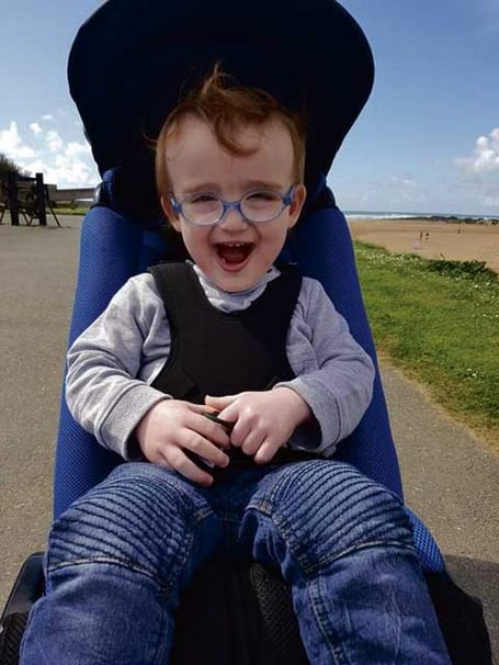 Local wheelchair services told Natasha and Neil that they couldn’t help Dexter until his third birthday. In the meantime, he had turned over his previous buggy, injuring his head. Dexter’s condition results in spasms, when his body goes rigid, and his head would bash against the unpadded sides.