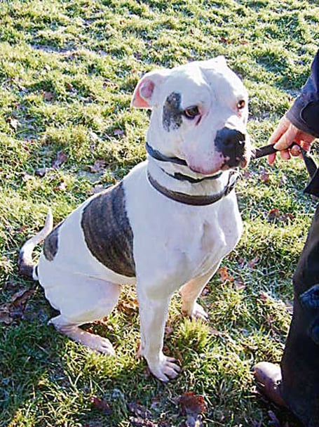 Zen is a three year old American Bulldog, white and brindle in colour, and has a 'lovely temperament.' She doesn't bark and appears to be good with children and other dogs.