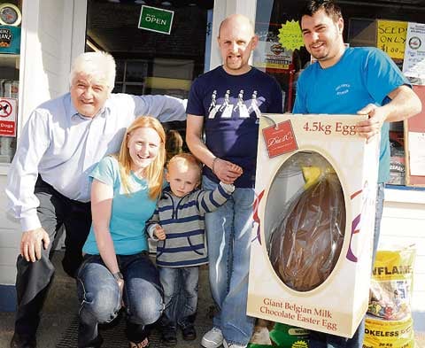 Smiles all around for Cadan Chenoweth, aged three of Delabole, as he collects his giant egg in an Easter draw held at the Delabole Stores which opened in December.