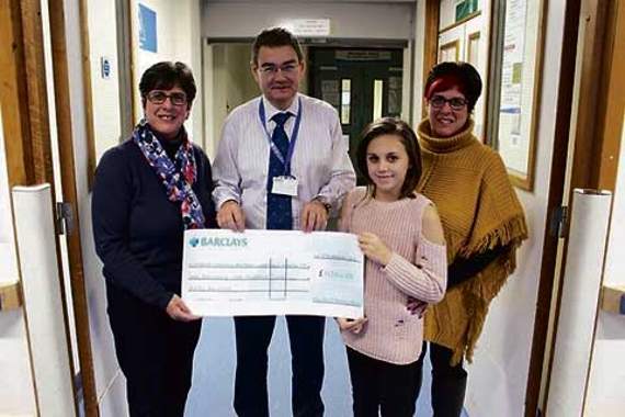 Kind-hearted Caitlin Bosley presented the cheque for £1,150 to Peter Whitfield, consultant neurosurgeon, outside of Moorgate Ward, alongside mum Diane and auntie Carolyn, as a thank you for caring for her mum.