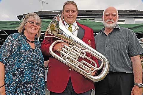 BAND: Lewis Baker proudly receives his new euphonium from John and Mary Pearce (the Friends of Camelford Town Band). Picture: Adrian Jasper, Delabole.
