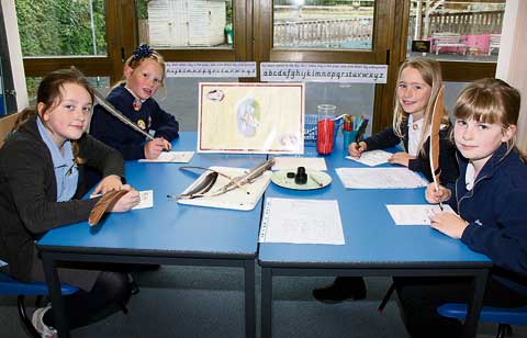 ANNIVERSARY CELEBRATIONS: Pupils Jessie Warren, Hester Presswell, Imogen Filer-Larwood, Michelle Simonsen are pictured above, using quills for hand writing. Below, Sophie Powell, Beulah Bridges, Sacha Palmer, Jed Burns and Zoe Wooldridge are shown with their pomanders. (Picture Dawn Bewes).
