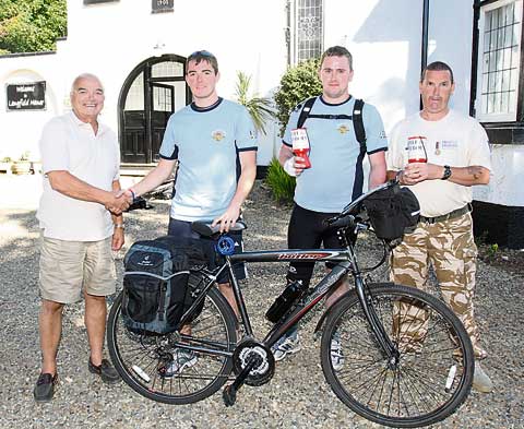 Mike Walker of Langfield Manor in Bude is pictured welcoming Sainsbury cyclists Mark McKeever and Jon Hindley after they had cycled from St Just recently. The two cyclists are raising money for Help for Heroes by cycling the length of Britain from Lands End to John O'Groats which is Sainsbury's chosen charity for the year. The route they have planned covers 1,044 miles and will take them 15 days since they began on Sunday, June 20. The two will be adding an extra 200 miles to their journey visiting 11 stores throughout the country including Bude who recently gave the lads a meal and liquid refreshments. Following an email a few months ago requesting free accommodation whilst on their journey, Mike and Suzanne Walker of Langfield Manor were quite happy to offer the two a bed for the night before making their way up to John O'Groats. Pictured also is local volunteer Chris Shennan who is an ex-serviceman. If you would like to donate to the cause and support Mark and Jon visit http://www.justgiving.com/cyclingtheuk">www.justgiving.com/cyclingtheuk.