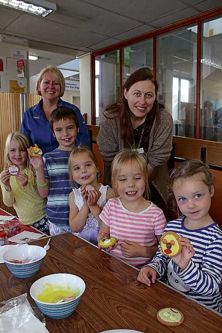 PICTURED at Launceston Library on Saturday with some of the children and biscuits they had designed are Shelley Vanstone from Tesco and senior library assistant Andi Snook. Picture: Paul Hamlyn