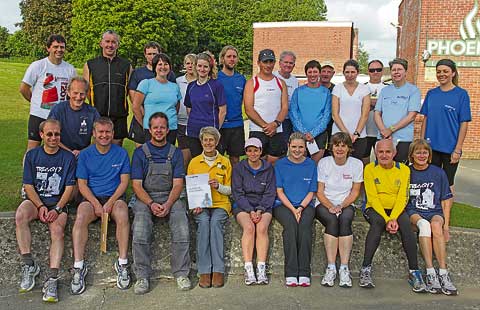 SUPPORT: Lavinia Archer, who serves on the Co-operative Area Committee is pictured presenting a cheque to Jon Spettigue, the Chairman of Launceston Road Runners. Also pictured are members of the running club just before starting their Tuesday night social run.
