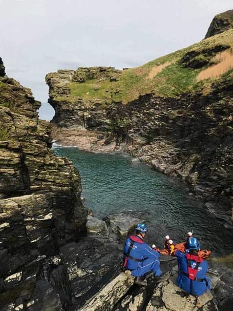 With members of Boscastle CRT having already ascertained that access to the casualty and his dog was extremely treacherous and that a rope rescue should be a last resort, and with sea conditions being very calm, it was decided that the best access would be from the water itself, and the Port Isaac Lifeboat was subsequently tasked by Falmouth Coastguard Operations Centre.