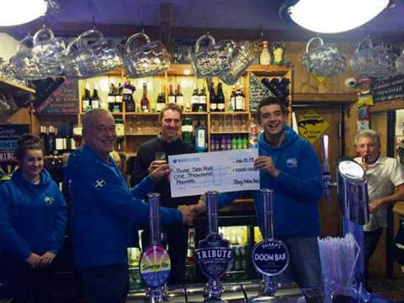 On Sunday, December 6, representatives from both the Friends of Bude Sea Pool and Macmillan Cancer Support were presented with cheques at the Bay View Inn. £1,000 went to the sea pool and £3,163.76 to Macmillan.
