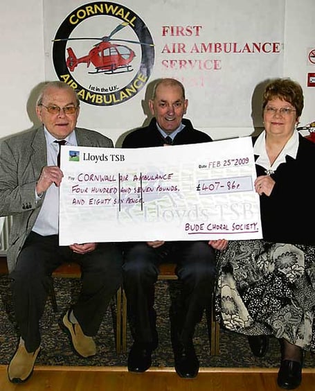 Bude Choral Society organised a concert of seasonal music at Christmas 2008 and invited a local choir of more than twenty young people called the Mini-Minstrels to take part in the programme. The proceeds of this musical event were presented to the representative of the Cornwall Air Ambulance, Arthur Newton by Veronica Jones, the Musical Director of the Mini-Minstrels and John Goacher, Chairman of Bude Choral Society on Wednesday, February 25. Due to the popularity of the last concert, plans are already in hand for another Christmas event for local charities in Bude Central Methodist Church on Sunday evening, December 13, 2009 and the Mini-Minstrels have been invited to sing again on that occasion.