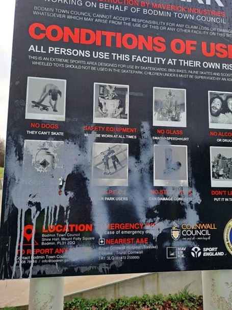 A spokesperson for Bodmin Town Council said: “Unfortunately, over the weekend, Bodmin Town Council property has been the victim of another spate of graffiti and vandalism. This time at the skate park in Priory Park, where the bins, signs and skate park itself were targeted.