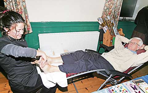 Reflexologist Samantha Rowe-Johnson is pictured above, carrying out a treatment on John Green.