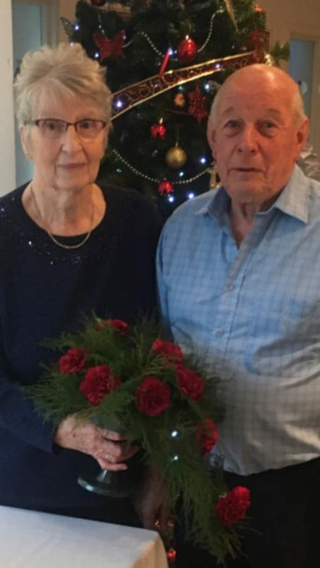 Roy and Winnie Hunkin of Launceston celebrated their diamond wedding anniversary on January 1, with a congratulatory card from the Queen and a surprise family party held at Trethorne Hotel and Golf Club. They are pictured with a floral arrangement they received that replicated the original bridal bouquet.