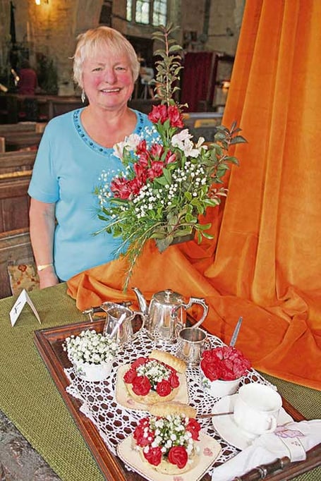 An arrangement at the churchyard gates invited visitors to climb the stone steps and walk up the church path to this year's flower festival representing 'Our Cornwall'. The community and semi-professionals united for a culmination of different ideas to represent this year's choice. The church path was decorated with coloured fish which were made by the children of the school and pre-school and were tied on netting with orange balls to represent buoys and there were also tubs of hydrangeas and gypsophila to represent the sea.