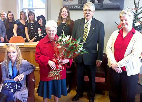 The firm said goodbye to Mrs Gwen Furse, who has kept the Westgate building spotlessly clean for the past 41 years. So thorough is her cleaning, that a number of the brass doorknobs have had to be replaced, as the old ones have worn away by years of diligent polishing with the Brasso.