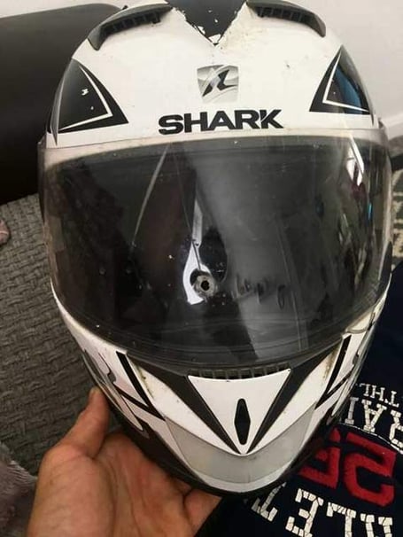 The father of two was on his motorbike on the way back home to Camelford from his job as a chef at Port Gaverne Hotel when something went through the front of his helmet, causing a 7mm round hole (pictured).