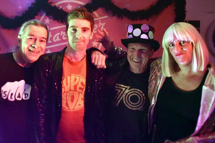 This weekend we were in top local music venue Callington Social club, courtesy of Manager Tracey Evans, with Glossy Glam Rock covers band Stargazer. The Truro(ish) based four piece took to the stage dressed in tassels, glitter jackets and flares with Luke on guitar and vocals, Jo on keyboards and vocals, Andy on bass and Jerry on drums and performed an absolutely storming set including T-Rex, Bowie and Slade, which soon had the dance floor pumping to some of the most popular tunes of the Glam Rock era.