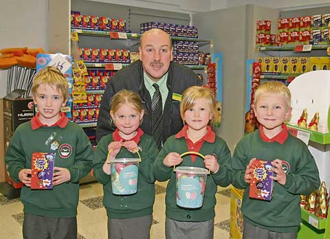 Pictured with Easter eggs kindly donated by the store are Bude Infants Jack Farmer, Lauren Dowling, Tegan Smith, Louis Newberry with store manager Shaun Jackson.