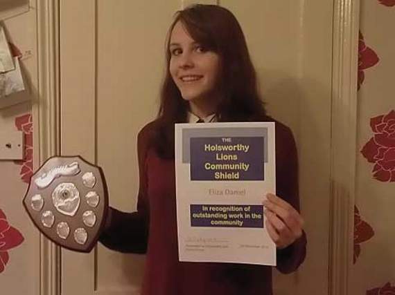 THE Holsworthy and District Lions Community Shield award for 2015 has been presented to Eliza Daniel after she did a parachute jump in aid of the Children’s Hospice South West.
