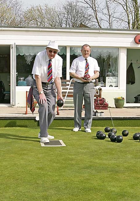 Mac Wood, Club President, bowls the first wood to open the 20190 season at Dunheved Bowling Club on Saturday April 10 watched by club captain Peter Prynne.