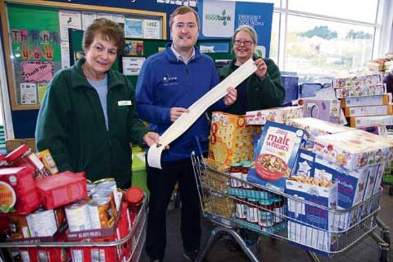 He raised £265 for his efforts and is pictured with Foodbank representatives, Pam Whitewood and Karen Milne, at Launceston Tesco on Friday, April 28, with food bought with the money raised.
