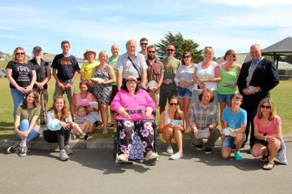 Next came an award ceremony when to musical accompaniment the following members of local environmental groups and individuals who had made outstanding contributions to a greener Bude received wooden plaques with the words ‘Meur Ras’ (‘thank you’ in Cornish), including: Ado Shorland of Widemouth Task Force; Pete Cooper of the Crackington Crew, absent; Paul and Laila Crum of Bude Rubbish Action Group; Claire Giner and Zoe Gascoyne of Parley Beach Cleans; Cllr Willingham, mayor Bude-Stratton; Martin Dorey of #2minutebeachclean; Sue Read, Kimp Stephens and Annie Creo of The Roundabout Group; Avril Sainsbury of The Cleaner Seas Project; Avril Sainsbury, Claire Giner, Deb Rosser and Simon Browning of A Greener Bude; Simon Browning and Ron Meredith of Friends of the Earth; Deb and team of The Refill Shop Team; Tilly Clarke and Elidh McCormick of The Repair Cafe; Trevor Plant of Trev’s Taxi, absent.