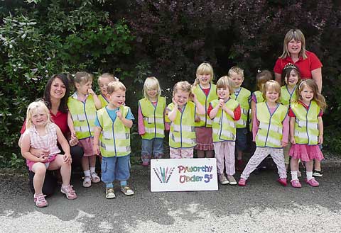 The children at Pyworthy Under Fives are pictured with their new high visibility bibs for their 'out and about trips', along with their new Playgroup sign. Both have recently been purchased through