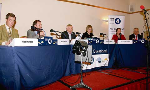 With Jonathan Dimbleby in the chair to keep order, the panellists were Welsh Secretary, Rt Hon. Peter Hain MP, Nick Herbert MP (Shadow Secretary of State for Environment, Food and Rural Affairs), Susan Kramer MP, (Lib Dem) and Nigel Farage (MEP and former leader of UKIP).