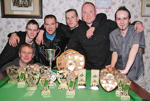 Olde Market Inn won Division Three and the KO Cup and received their trophies at the Holsworthy and District Pool League presentations — Ady Jupp, Tom Ross, Tom Schiller, Leo McDonnell, Nick Thorne and Carl Roomes, who with Tom Schiller were also runners-up in the doubles.
