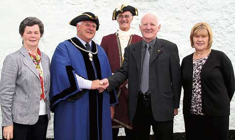 Current Portreeve and Portrevene of Holsworthy Russell and Gloria Dymond, accompanied by Town Crier Roger Dunstan, congratulated the Portreeve elect Philip and his wife Ann at a recent meeting. He takes over the position on July 10.