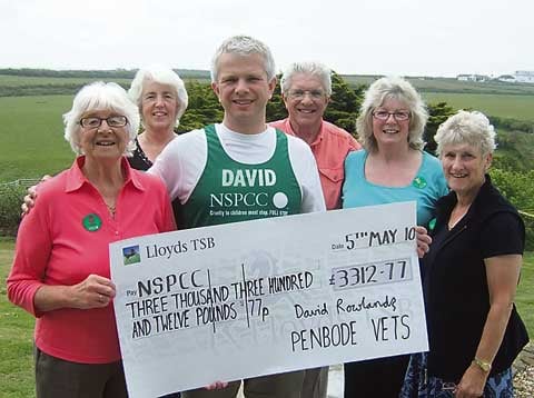 David Rowlands ran the London Marathon in aid of the NSPCC and completed it in 4 hours and 21 minutes. Penbode Veterinary Group in Holsworthy, where David is a partner, organised evening events and collecting sponsorship from staff and clients amounting to a grand total of £3,312.77. David presented the cheque to Diane Rowlands, his mother and local NSPCC co-ordinator, at her coffee morning on May 5. This was her 29th coffee morning when about 60 supporters raised an additional £460 for the charity.