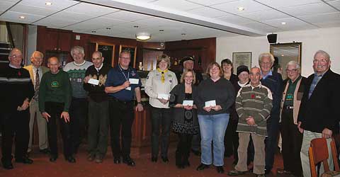 SUPPORT: Receiving the cheques are Colin Martin, Roger Vincent, Mike Ivey, David Edwards, Arthur Newton (DAA), Richard Goulding (Fire Fighters), Pauline Masters (Scouts), Vicky Tappin (Clawton Pre School), Holsworthy Portreeve Russell Dymond, Amanda Allin (Special Care Baby Unit), Tracey Horton (Clawton Pre-School), Jean Edwards, Brian Sillifant, Arthur Sillifant, Bill Dymond and Fred Vanstone.