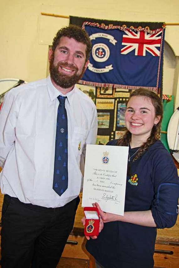 The service to the company was working with the anchor section. For her service to the community, Elizabeth helped with the meals and big breakfast at Morwenstow Community Centre and she helped with Messy Church. She also had to do leadership training with the 1st Redruth Brigade.