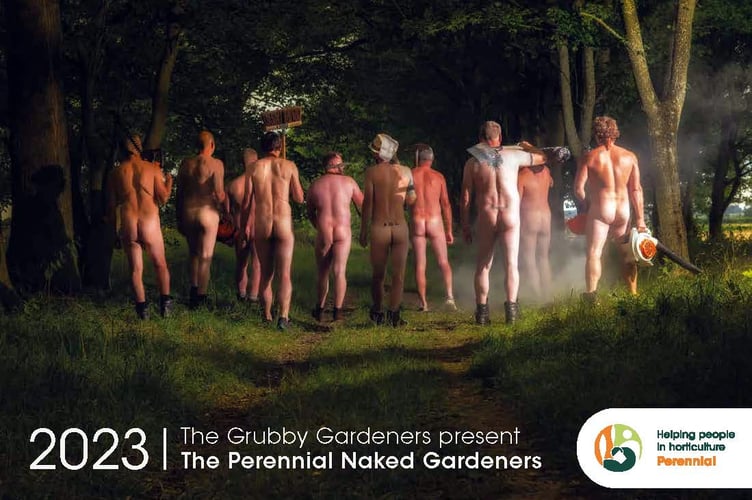 As per previous years, the calendar shows the Grubby Gardeners, formed in 2014 as a group of volunteers fundraising for Perennial, baring all for the charity.